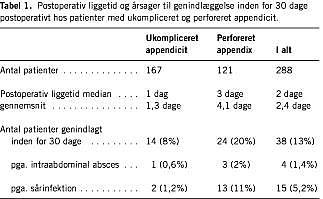 Den postoperative liggetid var median en dag hos patienter med ukompliceret appendicit og median tre dage ved perforeret appendix.