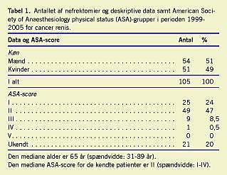 Den angivne mortalitet (1,6%) er i overensstemmelse med den nationale og i udlandet fundne og opgjorte mortalitet [7, 8]. Crude survival for nyrecancer fandtes i vores materiale at være 60% og er af samme størrelse som angivet i litteraturen[9, 10]. Om dette er gældende på landsplan, er uafklaret, men man må forvente, at crude survival stiger pga. bedre diagnostik og det stigende antal af tilfældigt fundne tumorer på landsplan. Vi finder det vigtigt at kortlægge cancersygdommen først, inden man tager stilling til, hvilken behandling man vil tilbyde patienten, hvilket kan være en del af forklaringen på den lave mortalitet. Vi opererer dog patienter i alle American Society of Anaesthesiology physical status (ASA)-grupper, men flest i gruppe 2 (47%) (Tabel 1)