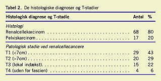 Der blev i undersøgelsesperioden foretaget 123 nefrektomier for malign eller benign nyrelidelse. Der blev diagnosticeret i alt 105 patienter med cancer renis (54 mænd og 51 kvinder, medianalder 65 år (spændvidde: 31-89 år)). Heraf blev 85 nefrektomeret (Tabel 1 ). De histologiske data ses i Tabel 2 . Den mediane indlæggelsestid var syv døgn (spændvidde: 3-29 døgn), og det mediane antal transfusioner var 0 (spændvidde: 0-8 transfusioner).