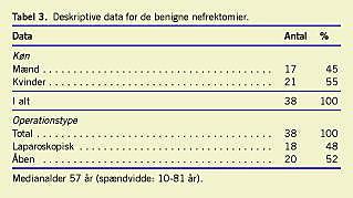Materiale og metoder: I perioden fra den 1. juni 1999 til den 1. juni 2005 blev der foretaget 123 nefrektomier. I alt 105 patienter fik påvist cancer renis, 46 af disse fik foretaget en laparoskopisk nefrektomi, og 39 gennemgik en åben operation. Tyve patienter havde dissemineret sygdom. Otteogtredive fik foretaget nefrektomi pga. benign årsag f.eks. hydronefrose, sten eller udslukt nyre. Patienterne med malign sygdom blev fulgt postoperativt efter de rekommandationer der foreligger fra European Association of Urology.