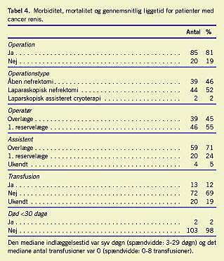Resultater: Der blev i seksårsperioden diagnosticeret 105 patienter (54 mænd og 51 kvinder) med cancer renis, og 85 af dem gennemgik et operativt indgreb. Den mediane indlæggelsestid var syv døgn (spændvidde: 3-29 døgn). Det mediane antal transfusioner var 0 (spændvidde: 0-8). I 55% af tilfældene blev operationen foretaget af en læge under uddannelse. Crude survival ved cancer renis var 60%. Der blev lavet 38 nefrektomier hos patienter med benign årsag. Den samlede perioperative mortaliteten var 1,6% (to patienter).