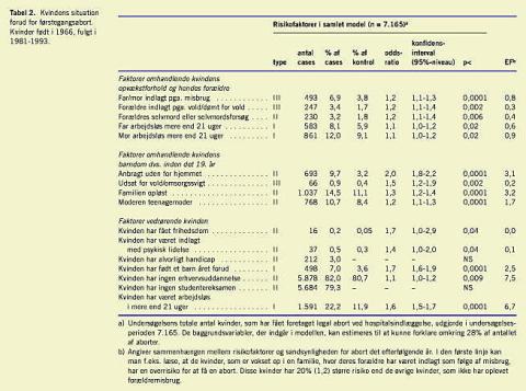 Af den kvantitative del af undersøgelsen fremgår det, at der især er tre grupper, som har forhøjet risiko for at komme i en situation, hvor de ønsker at få foretaget en abort: Kvinder, som har haft vanskelige forhold i deres opvækst (anbragt uden for hjemmet, været udsat for omsorgssvigt eller vold), kvinder, som har en dårlig arbejdsmarkedsmæssig tilknytning (langvarig arbejdsløshedsperiode året før aborten) og kvinder, der har født inden for det sidste år (Tabel 2 ).