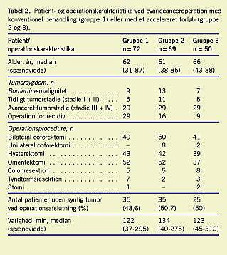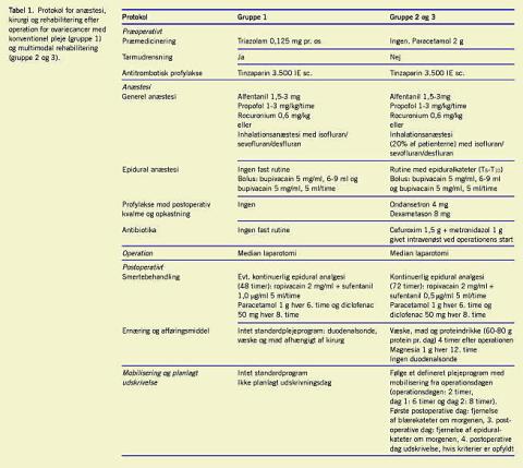 På Gynækologisk Klinik, Rigshospitalet, blev 72 konsekutive patienter, der var blevet opereret for ovariecancer (gruppe 1) med konventionel behandling, undersøgt retrospektivt fra journalmateriale fra perioden 1. januar 2003 til 30. september 2003 og sammenlignet med de initiale 69 konsekutive patienter, der var opereret i regi af et nyetableret accelereret operationsregimen mellem den 1. oktober 2003 og den 31. december 2004 [6], og 50 konsekutive patienter, der var opereret i perioden fra den 1. januar 2005 til den 15. september 2005. De to sidstnævnte grupper blev undersøgt prospektivt. Såfremt en patologi viste benign lidelse eller anden kræfttype end ovariecancer, blev patienten ekskluderet. Det perioperative behandlingsprogram er opsummeret i Tabel 1 . De samme tre onkogynækologiske operatører opererede alle patienter. Den kirurgiske teknik inklusive lymfeknuderesektion fulgte internationale retningslinjer (Fédération Internationale Gynécologie et Obstétrique).