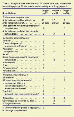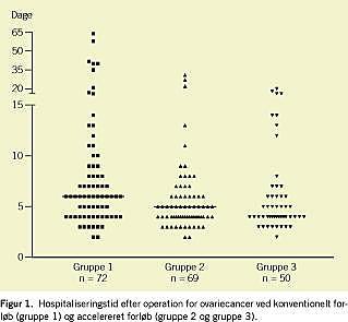 I en række studier af abdominal hysterektomi [3] og elektiv colonkirurgi [7-12] har man dokumenteret, at de evidensbaserede principper for flerstrenget rehabilitering (accelererede operationsforløb) leder til en hurtigere reetablering af organfunktioner og deraf følgende nedsat risiko for medicinske komplikationer og hospitaliseringsbehov [7, 8]. Den aktuelle serie af konsekutive patienter, der var opereret for ovariecancer før og efter introduktion af et accelereret operationsforløb, konfirmerer, at denne behandlingspakke, der inkluderer præoperativ information, kontinuerlig epidural analgesi, tidlig oral ernæring og mobilisering, leder til hurtigere rehabilitering, et reduceret hospitaliseringsbehov og tendens til færre medicinske komplikationer end et konventionelt behandlingsregimen. Raten for alvorlige medicinske komplikationer var signifikant lavere efter indførelse af den accelererede behandlingspakke (ni patienter i gruppe 1 mod en patient i gruppe 2 + 3). Der var dog flere med alvorlig sygdom (recidiv) i gruppe 1 end i gruppe 2 + 3, hvilket kan have medvirket til denne forskel.