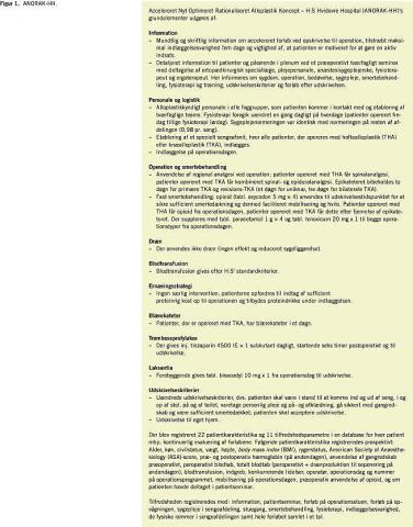 Der udvikledes et accelereret forløb, ANORAK-HH, efter at alle delelementer af alloplastik-patienters forløb fra henvisning til udskrivelse på Ortopædkirurgisk Afdeling, H:S Hvidovre Hospital var undersøgt og optimeret. ANORAK-HH's grundelementer fremgår af Figur 1 .