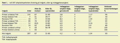 Resultater: 95% af patienterne, som blev opereret med primær hofte- eller knæalloplastik, kunne udskrives senest på femte dagen med en gennemsnitlig indlæggelsesvarighed på 3,9 dage. Tilfredsheden androg mediant ti (af ti) med alle delelementer og en gennemsnitlig tilfredshed med det samlede forløb 9,4. Der var ikke flere genindlæggelser end ved længere forløb. Deltagelse i patientseminar mindskede ikke indlæggelsesvarigheden og øgede ikke tilfredsheden. Firs patienter var indlagt i maks. tre dage; disse patienter var karakteriseret ved operation først på ugen og ved manglende behov for blodtransfusion.