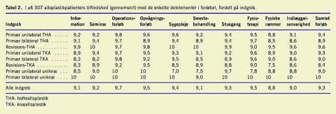 Der var ingen sammenhæng mellem alder, køn, deltagelse i patientseminar, nummer på operationsdagen eller mobilisering på operationsdag og tilfredshed på nogen af de 11 delpunkter.