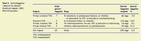 20 patienter blev genindlagt i løbet af tre måneder efter operation i ANORAK-HH-forløb (Tabel 3 ). En patient opereret med primær, unilateral THA blev genindlagt til smertebehandling og en patient opereret med primær unilateral TKA blev genindlagt til mobilisering, omend patienten var fuldstændig selvhjulpen og velmobiliseret. De øvrige genindlæggelser skønnes uden relation til det accelererede forløb.