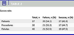 Alle patienter havde komplekse fistler. Der blev udført 38 indgreb med i alt 40 anal fistula plug -anlæggelser på 37 patienter. En patient blev forsøgt behandlet to gange, begge gange uden succes. To patienter blev behandlet for to synkrone fistler med dobbelt plug -anlæggelse under samme indgreb. Succesraten pr. patient var 45,9% (17/37), pr. fistel 47,5% (19/40) og pr. procedure 44,7% (17/38). Efter 11 af de 38 indgreb faldt plug 'en ud (28,9%), og dette udgjorde således 52,4% af de mislykkede plug -anlæggelser. Den mediane followuptid var 125 (28-1.248) dage for gruppen, der opnåede heling af deres fistel, og 35 (7-321) dage for gruppen, der ikke opnåede heling af deres fistel (p = 0,008). Med hensyn til patienternes alder, køn, antal fistler, fistelanatomi, ætiologi, tidligere fistelkirurgi og eventuel drænerende seton-behandling var der ingen signifikant forskel mellem de to grupper. Der var ingen patienter, der rapporterede om inkontinens efter anal fistula plug -anlæggelse.