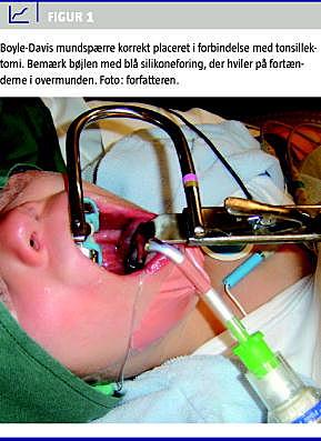 For at få adgang til tonsillerne foretages i forbindelse med tonsillektomi mundopspærring. Til dette formål findes flere forskellige typer mundspærrer. Den hyppigst benyttede i Danmark er Boyle-Davis mundspærre. Boyle-Davis mundspærre placeres dels på fortænderne i overmunden, og er her foret med en silikoneplade, dels mod tungen, hvorved denne holdes ned mod mundgulvet (Figur 1 ). Der findes andre mundspærrer, for eksempel McIvors mundspærre, der primært anvendes, hvis patienten er uden tænder i overmunden - og altså kun sjældent bruges, når børn tonsillektomeres [2].