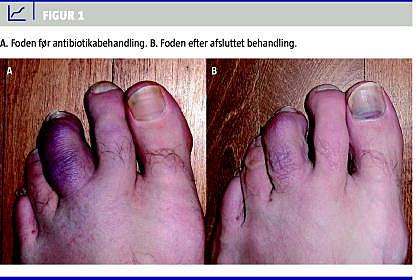 En 29-årig, rask mand fik over en fireårig periode progredierende hævelse og blålig/violet misfarvning af tredje tå på venstre fod. Hævelsen strakte sig op på fodryggen og over på nabotæerne, og der tilkom smerter under forfoden, Figur 1 A.
