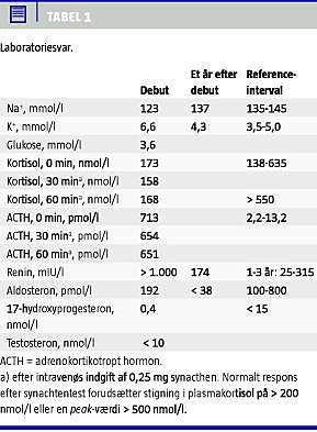 Under indlæggelsen bemærkedes hyperpigmentering. På mistanke om binyrebarkinsufficiens blev der lavet synacthentest med indgift af 0,25 mg syntetisk ACTH, idet der til tiden 0, 30 og 60 minutter måltes henholdsvis kortisol og corticotropin (ACTH) (se Tabel 1 ). Synacthentesten bekræftede diagnosen primær binyrebarkinsufficiens pga. forhøjet adrenokortikotropt hormon (ACTH) og renin samt mangelfuld stigning i kortisol, og man startede behandling med glukokorticoid, hydrocortisontabletter 15 mg/m2 /døgn fordelt på tre doser.