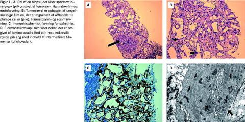 Lysmikroskopisk fandtes tumorvæv med små øer af normalt udseende binyrebark (Figur 1A). Tumorvævet bestod af uregelmæssige kirtel- eller karlignende strukturer, der var udklædt af celler med en betydelig pleomorfi (Figur 1B). Tumor havde ingen lighed med tidligere biopsi fra leveren. Immunhistokemisk var tumor positiv for calretinin (Figur 1C), og elektronmikroskopisk fandtes celler med talrige intermediære filamenter, basallamina og desmosomer (Figur 1D) - men ingen sekretgranula. Den patoanatomiske diagnose var en adenomatoid tumor.