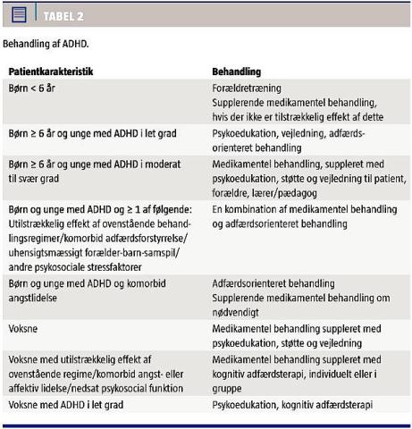 Ved ADHD benyttes medikamentel og psykosocial behandling. Psykosocial behandling dækker over en kombination af psykoedukation, vejledning, støttende samtaler, tilpasning af det daglige miljø i f.eks. skole og daginstitution og adfærdsorienteret behandling i form af f.eks. forældretræning eller kognitiv adfærdsterapi til unge og voksne. Der er nogen evidens for at benytte forældretræning i behandlingen af ADHD hos børn. De bedste resultater er fundet ved behandling af småbørn [21, 22]. I et Cochranereview om social færdighedstræning til skolebørn konkluderede man, at der ikke var effekt på sociale kompetencer, adfærd og ADHD-symptomer og ingen evidens for denne behandling [23, 24]. Kognitiv adfærdsterapi benyttes i stigende grad hos unge og voksne med ADHD (Tabel 2), mhp. både at træne kompensatoriske mekanismer og behandle evt. komorbiditet. Den foreliggende litteratur tyder på en signifikant effekt på både symptomer, funktion og eventuel komorbiditet [24].