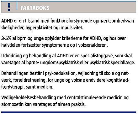 synaptiske genoptagelse af dopamin. Dosisstørrelse og -hyppighed er meget individuelt og afhænger bl.a. af patientens behov for at være dækket ind af medicin i eftermiddags- og aftentimerne. Således vil unge og voksne ofte have behov for dette. Atomoxetin (ATX) er et noradrenalin-genoptagelses-inhibitor-præparat. Det er ikke centralstimulerende, men øger mængden af noradrenalin og i præfrontale cortex tillige mængden af dopamin i synapsespalten. ATX benyttes især, når der er behov for døgndækkende behandling af angst, depressive symptomer eller misbrug og ved intolerable bivirkninger af centralstimulerende medicin. I klinikken benytter man af og til en kombination af ATX og MPH ved partiel respons. Der er inkonsistent dokumentation for effekt og bivirkninger ved denne behandling, hvilket er belyst i to mindre studier [26, 27].