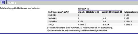 Den europæiske fedmeorganisation European Association for the Study of Obesity (EASO) præsenterede en opdateret behandlingsvejledning ved den europæiske fedmekongres i 2008 [3]. Vejledningen indeholdt retningslinjer for behandling afhængig af body mass index (BMI), taljeomkreds og følgesygdomme (Tabel 1 ). Fundamentet for enhver behandling er livsstilsintervention, der kan kombineres med medicin eller kirurgi. Tillæg af medicin bør overvejes ved BMI > 30 kg/m2 uden følgesygdomme eller BMI > 25 kg/m2 med følgesygdomme. Mens kirurgi først bør overvejes ved BMI > 40 kg/m2 uden følgesygdomme eller BMI > 35 kg/m2 med følgesygdomme. Overvejelserne om tillæg af medicin eller kirurgisk intervention omfatter minimum 400.000 danskere med BMI > 30 kg/m2 eller en taljeomkreds for mænd > 94 eller kvinder > 80 cm.