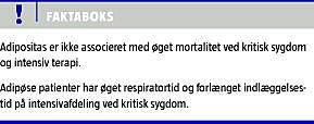 Summary Obesity is not associated with an increased mortality in critical disease and intensive care Ugeskr Læger 2010;172(7):537-539 The prevalence of obesity is increasing. The mortality and morbidity among obese intensive care unit (ICU) patients has been a matter of concern. Most of the retrospective studies performed have yielded contradictory results. Recently, two large prospective studies showed that respiratory failure, length of mechanical ventilation and ICU acquired infections were increased in obese patients. Obesity was, however, not associated with increased mortality. The results were confirmed by a meta-analysis which showed that obesity was associated with increased morbidity but not with increased mortality.