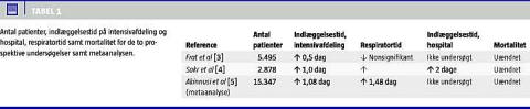 Tidligere retrospektive undersøgelser, de fleste fra USA, af effekten af adipositas på mortaliteten ved intensiv terapi har vist modstridende resultater, idet man i flere studier har påvist øget morbiditet og mortalitet hos adipøse, mens andre ikke har fundet nogen forskel eller endda har observeret en reduceret mortalitet. I et nylig publiceret fransk prospektiv multicenter-epidemiologistudie vurderedes effekten af et højt BMI på mortaliteten ved kritisk sygdom og intensiv behandling på i alt 5.495 patienter (Tabel 1 ). I denne undersøgelse [3] var BMI i adipositasgruppen 42, mens BMI i den normalvægtige gruppe var 24. Alle patienterne var respiratorbehandlede i mere end to døgn. Man undersøgte effekten af adipositas på nosokomiel infektion, varigheden af mekanisk ventilation, postekstubationsstridor, organdysfunktion, indlæggelsestid og mortalitet på intensivafdeling samt på hospital. De adipøse patienter havde ikke øget mortalitet, idet mortaliteten på intensivafdeling var 24% blandt adipøse versus 25% blandt normalvægtige. Derimod var der flere vanskelige intubationer og hyppigere postekstubationsstridor (15,3% versus 3,3%) i den adipøse gruppe.