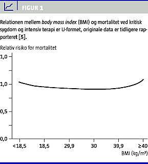 Ligeledes i 2008 publicerede Akinnusi et al [5] en metaanalyse for at undersøge associationen mellem adipositas og effekten af intensiv terapi. Denne amerikanske forskergruppe ønskede også at undersøge, om der var en dosis-respons-effekt af forhøjet BMI på mortaliteten under intensiv terapi. Metaanalysen inkluderede 14 studier fra 1966-2007, hvorfor ovennævnte to europæiske prospektive studier af Frat et al [3] og Sakr et al [4] publiceret i 2008 ikke indgik i undersøgelsen. Metaanalysen [5], som inkluderede 15.347 adipøse patienter fra USA, Europa, Australien og Mellemøsten, viste, at adipositas ikke var associeret med en øget mortalitet under indlæggelse på intensivafdeling. Den adipøse gruppe havde endog en større overlevelse ved udskrivning fra hospital. I seks studier undersøgtes effekten af adipositas på respiratorbehandlingstiden. Længden af respiratorbehandlingen var 1,48 dage længere hos patienter med højt BMI, hvilket var signifikant. Den længere respiratorbehandlingstid kunne forklares ved den kompromitterede lungefunktion hos adipøse. Indlæggelsestiden på intensivafdeling var også signifikant længere (1,08 dage) hos de adipøse patienter. Forfatterne mente, at en højere frekvens af perioperative sårinfektioner blandt adipøse kunne forklare den længere indlæggelsestid. En subgruppeanalyse kunne påvise en forbedret overlevelse hos patienter med moderat adipositas (BMI 30-39,9) sammenlignet med normalvægtige. Ved en BMI > 40 observeres denne overlevelsesfordel dog ikke. Hos magre patienter med et BMI < 18,5 var det lave BMI associeret med øget mortalitet, hvilket er bekræftet i andre undersøgelser [6]. Associationen mellem B MI og mortalitet ved kritisk sygdom og intensiv terapi er således U-formet (Figur 1 ).