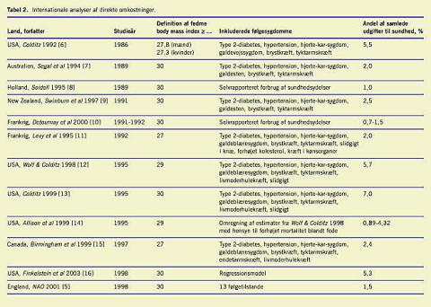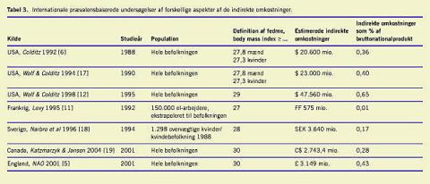 Fire studier skiller sig ud. To er fra USA og må for modes at repræsentere den størst tænkelige forskel i forhold til Danmark [21, 22]. De to andre undersøgelser er baseret på den svenske SOS-undersøgelse og vedrører henholdsvis merforbruget af medicin i en meget svært overvægtig gruppe, BMI >40, sammenlignet med forbruget i en normal gruppe i befolkningen, BMI ≤25 [23] og forbruget af sygehusydelser hos svært overvægtige efter kirurgi sammenlignet med forbruget hos en kontrolgruppe [24].