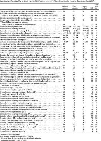 Resultater: Svarprocenten var 91. Færre sygehuse (76%) behandlede adipositas i 2000 end i 1987. Omkring 1.400 patienter blev henvist, og 500-900 patienter blev afsluttet årligt. Mange afdelinger afviste patienter, hvis den primære henvisningsdiagnose var adipositas, ofte pga. ressource- eller kapacitetsproblemer. Med undtagelse af på landsdelssygehusene blev adipositas anno 2000 i højere grad behandlet ambulant end i 1987. Der er ikke stor forskel på, hvilke metoder man benyttede, fraset kirurgi, til at behandle adipositas på de forskellige typer sygehuse. Med hensyn til instruks for behandling, opfølgning af adipositas, kvalitetssikring og evaluering af adipositasbehandlingen samt forskning fandt dette sted i noget omfang på landsdelssygehusene samt i Københavnsområdet og kun i mindre omfang på henholdsvis centralsygehusene og de firedelte sygehuse.
