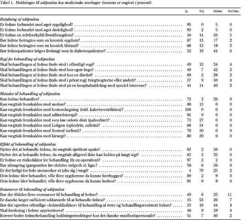 Resultater: Svarprocenten var 89. 16% svarede ja til om de mente, at adipositas er en selvforskyldt livsstilssygdom, mens 56% svarede måske. 66% mente, at adipositas bør betragtes som en kronisk tilstand, men kun 32% mente, at adipositaspatienter skal følges livslangt. 50% mente, at behandling af adipositas skulle ske i offentlig regi. De fleste mente, at hvis adipositas blev behandlet, ville sygdom kunne forebygges eller bedres. 72% mente, at adipositas kan behandles. 35% svarede måske til, om det nyttede at behandle adipositas, da vægttab sjældent opnås på langt sigt, og 25% svarede måske til, om det er farligt for fede personer at tabe i vægt. 50% mente, at der bør tildeles flere ressourcer til behandling af adipositas, og at forskning i adipositas skulle opprioriteres, mens kun få svarede nej (6-9%). 33% mente, at der var behov for offentlige adipositasklinikker. Kun 15% mente, at danske læger var sufficient uddannede til at behandle adipositas, og kun 9% svarede nej til, at bedre adipositasbehandling krævede holdningsændringer hos det danske sundhedspersonale.