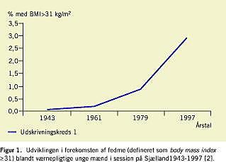Sessionsdata viser, at der i årene umiddelbart efter anden verdenskrig og frem til midten af 2004 er sket en øgning af forekomsten af svær overvægt blandt unge mænd - fra ca. fem ud af 1.000 i 1948 til 72 ud af 1.000 i 2004. Figur 1 viser, at fedmeepidemien blandt værnepligtige unge mænd har udviklet sig i to faser, dels en ca. ti år varende stigning hos fødselsårgangene fra begyndelsen af 1940'erne, og efter en stabil periode på ca. 20 år en ny kraftigere og fortsat pågående stigning hos fødselsårgangene fra begyndelsen af 1970'erne [2]. Man har ikke i nogen anden form for befolkningsundersøgelse nogensinde dokumenteret tilsvarende store stigninger. En væsentlig grund til dette er, at man i andre opgørelser må benytte sig af informationer om højde og vægt indhentet fra spørgeskema- eller helbredsundersøgelser af større befolkningsgrupper. Spørgeskemaoplysninger om højde og vægt er mindre sikre, og undersøgelser viser, at kropshøjder generelt overvurderes, og kropsvægte undervurderes. Desuden lider begge typer undersøgelser under afhængigheden af frivillig deltagelse. Man har i undersøgelser påvist, at det i højere grad er de normalvægtige, der vælger at deltage i befolkningsundersøgelserne, mens en større andel af de overvægtige bliver væk. I et tidligere studie har man således dokumenteret, at forekomsten af svær overvægt målt ved session blandt de mænd, som ikke ønskede at deltage i Østerbroundersøgelsens anden runde i 1982-1983, var på 50%, mens kun ca. 20% af de normalvægtige mænd var at regne blandt ikkedeltagerne.