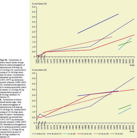 Samtlige danske undersøgelser på området bekræfter altså billedet af en fedmeepidemi også blandt børn, hvad enten man i undersøgelserne anvendte objektive mål [5, 7] eller selvrapporterede data [6], hvad enten man beskrev regionale populationer [7, 4] eller nationale populationer [5, 6], og uanset hvilken aldersgruppe inden for skolealderen der rapporteres om. Samtlige grupper udviser en voldsom stigning i fedmeforekomsten, særligt blandt drengene, som ellers hidtil i undersøgelserne har ligget noget lavere i prævalens end pigerne.