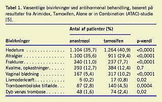 Tamoxifen og aromatasehæmmerne er relativt atoksiske. Erfaringer fra de randomiserede forsøg viser, at patienterne gennemgående har flere bivirkninger af tamoxifen end af aromatasehæmmere (Tabel 1 ). Alle aromatasehæmmere har den samme bivirkningsprofil. De hyppigste bivirkninger, som er hedeture, knogle-led-smerter og ændret knoglemetabolisme, er relateret til reduktionen af cirkulerende østrogen til næsten umålelige værdier. Patienter, der er blevet behandlet med aromatasehæmmere, har en signifikant øget risiko for atralgier [5, 6] og frakturer [5, 7] end patienter, der er blevet behandlet med tamoxifen. Da aromatasehæmmere ikke har tamoxifens østrogenagonistiske effekt, er der signifikant reduceret hyppighed af gynækologiske komplikationer [5, 6, 8] som livmoderkræft, vaginalblødning og udflåd hos patienter behandlet med aromatasehæmmere. Der er yderligere rapporteret om signifikant lavere risiko for tromboemboliske tilfælde ved behandling med aromatasehæmmere end ved behandling med tamoxifen [5-7]. Langtidsbivirkninger af aromatasehæmmere er endnu ikke fastlagt, især graden og den kliniske betydning af disse, men teoretisk mulige langtidseffekter relaterer sig til ændret knogle- og lipidmetabolisme (osteoporose og aterosklerose).