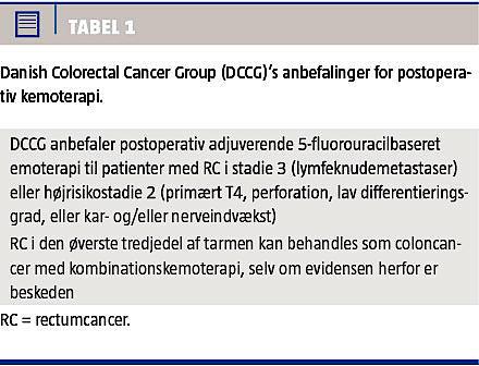 Ovenstående er i overensstemmelse med de opdaterede retningslinjer i Danish Colorectal Cancer Group (Tabel 1), hvori der anbefales adjuverende 5FU-baseret kemoterapi til patienter med RC stadie 3 og højrisikostadie 2 (primært T4, perforation, lav differentieringsgrad eller kar- og/eller nerveindvækst). RC i den øverste tredjedel af tarmen kan behandles som CC med kombinationskemoterapi, selv om evidensen herfor er beskeden [3].