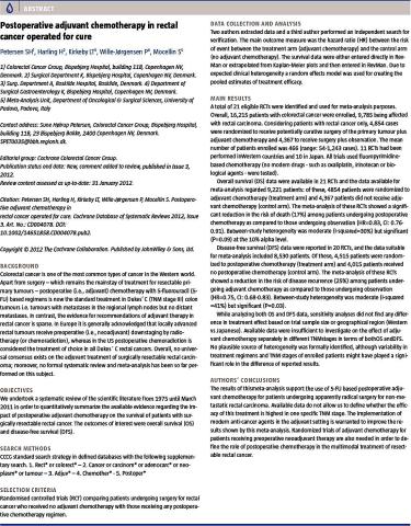 <li><p>Petersen SH, Harling H, Kirkeby LT et al. Postoperative adjuvant chemotherapy in rectal cancer operated for cure. Cochrane Database Syst Rev 2012;3: CD004078. </p></li>