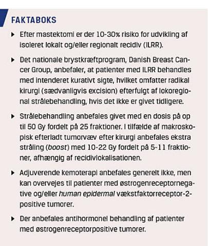 Danish Breast Cancer Cooperative Group (DBCG) anbefaler, at patienter med ILRR behandles med kurativt sigte med radikal kirurgi og efterfølgende lokoregional strålebehandling til patienter, som ikke tidligere har fået strålebehandling. Adjuverende kemoterapi anbefales generelt ikke, men antihormonel behandling anbefales til patienter med østrogenreceptor (ER)-positive tumorer [4]. I denne artikel gives der en opdatering af foreliggende randomiserede forsøg med