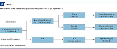 Godkendelse af nye lægemidler, især nye aktive substanser, sker på et fælles europæiske niveau (Figur 1). Samarbejdet har ført til en styrkelse og en harmonisering af de administrative procedurer for godkendelse af lægemidler i EU.