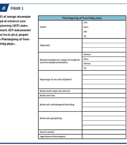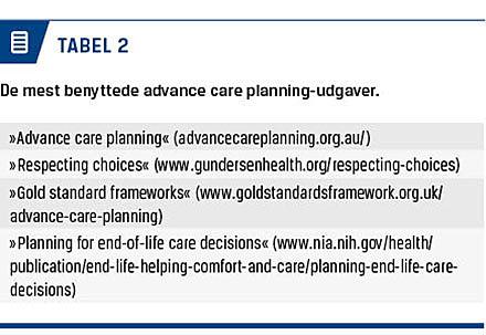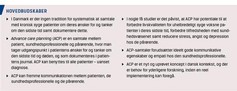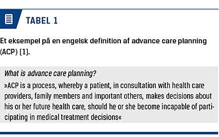 I engelsksprogede lande (Storbritannien, Australien, USA og Canada) har der siden 1990’erne været interesse for ACP. ACP betyder direkte oversat til dansk planlægning af fremtidig pleje og behandling og er en samtale mellem patient, sundhedspersonale og om muligt pårørende, hvor man tager udgangspunkt i patientens ønsker for og tanker om den sidste tid og døden (Tabel 1). Samtalen indeholder italesættelse af, hvor patienten ønsker at være i den sidste tid. Endvidere opfordres patienten til at beslutte, hvem af de pårørende der kan være »talerør«, hvis patienten kommer i en situation, hvor han/hun ikke længere kan give udtryk for ønsker angående livsforlængende behandling og genoplivning [1]. Samtalens hovedpunkter dokumenteres efterfølgende i patientens journal.