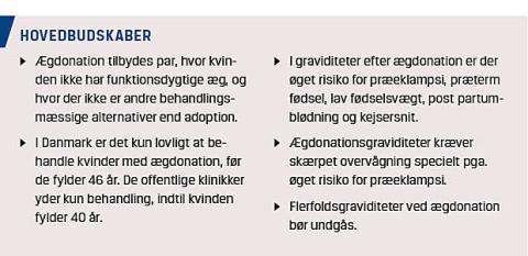 Par, som skal have ægdonationsbehandling, bør informeres om, at graviditet og fødsel efter ægdonation indebærer en større risiko for præeklampsi, præterm fødsel, lav fødselsvægt, post partum-blødning og kejsersnit end graviditet og fødsel efter spontan undfangelse eller efter IVF-behandling med kvindens egne æg. Idet flerfoldsgraviditet yderligere øger risikoen for disse komplikationer, bør oplægning af ét æg være standard ved ægdonationsbehandling.