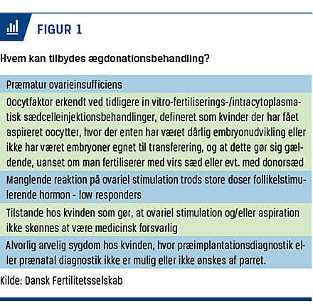 In Denmark, oocyte donation is allowed for women below 46 years of age if sperm from the woman&rsquo;s husband/partner is used, thus assuring genetic relationship with one parent. New legislation has provided more donors implying both shorter waiting time until treatment and more pregnancies achieved with donated oocytes. Oocyte donation preg&shy;nancies have increased risks of pre-eclampsia, post-partum bleeding, caesarean section, low birth weight and preterm birth, and since these risks are aggravated in multiple pregnancies, single embryo transfer is recommended.