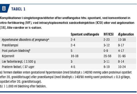 De omtalte komplikationer forekommer med øget hyppighed i flerfoldsgraviditeter end i singletongraviditeter, uanset om undfangelsen er sket spontant, ved IVF eller ved ægdonation. I flerfoldsgraviditeter efter ægdonation har især risikoen for hypertensive lidelser vist sig at være stor; således rapporteres der om forekomst af 24-63% hypertensive disorders of pregnancy og 16-46% præeklampsi [16]. Storgaard et al fandt i deres metaanalyse, at præeklampsi forekom med en aldersjusteret oddsratio på 3,3 (95% konfidens-interval: 1,6-6,8) i flerfoldsgraviditeter efter ægdonation sammenlignet med flerfoldsgraviditeter efter IVF/ICSI [16]. Ved oplægning af donoræg bør der derfor kun oplægges ét æg.