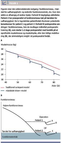 Da skeletmuskulatur samtidig er en vigtig kilde til aminosyrer i forbindelse med det katabole respons efter operative indgreb, udgør sarkopeni formentlig også en selvstændig risikofaktor. Prævalensen af sarkopeni er i flere studier påvist være på op til 50% for mænd og 70% for kvinder over 60 år, og hos disse ældre er sandsynlighed for selvrapporterede funktionsproblemer 2-3 gange større end hos ældre uden sarkopeni [3]. Endelig er nedgang i funktionsevne under hospitalisering forbundet med en markant forøget risiko for plejehjemsanbringelse og mortalitet [4], hvilket understreger vigtigheden af at modvirke muskeltab og dermed funktionstab under indlæggelse specielt hos ældre patienter (Figur 1).