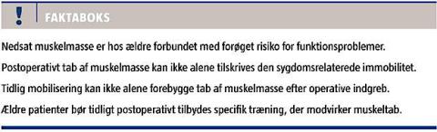 Ved katabole tilstande er skeletmuskulaturen den største donor af aminosyrer, hvilket medfører et tab af muskelmasse, der ligger ud over, hvad der kan tilskrives den sygdomsrelaterede immobilitet [2]. Kirurgi resulterer desuden i generelt nedsat fysisk formåen og reduceret muskelkraft, og hertil skal lægges den lokale påvirkning fra eventuel spaltning eller overskæring af muskulatur ved selve indgrebet. At tidlig mobilisering ved accelererede patientforløb ikke alene kan forebygge tab af muskelmasse efter operative indgreb [2], understreger vigtigheden af at supplere med specifik træning, der vides at modvirke muskeltab [5].
