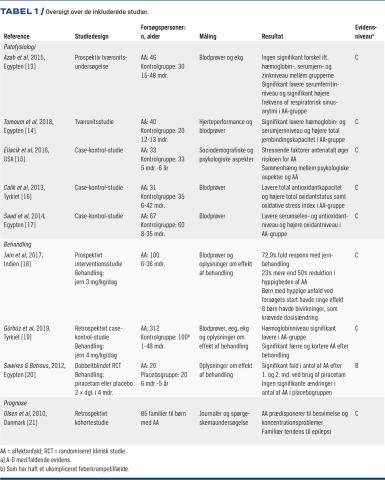I et tværsnitsstudie med 46 børn med AA og 30 raske kontrolpersoner blev der ikke fundet signifikante forskelle i serumniveau af jern, zink, hæmoglobin og røde blodlegemer mellem de to grupper [13]. Der blev fundet en signifikant forskel i serumniveau af ferritin mellem grupperne, hvor børn med AA havde et lavere niveau [13]. I et andet studie med 40 børn med AA og 20 raske søskende som kontrolpersoner blev der fundet et lavere serumniveau af jern og hæmoglobin og en højere totaljernbindingskapacitet i patientgruppen end i kontrolgruppen [14]. I et tyrkisk case-kontrol-studie med 66 børn, hvoraf halvdelen var diagnosticeret med AA, blev der ikke fundet en sammenhæng mellem jernmangelanæmi og AA [15].