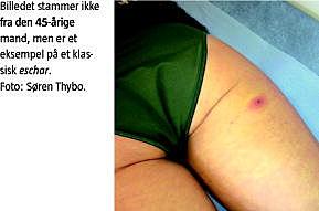 Objektivt blev patienten fundet stabil hvad angik luftveje, vejrtrækning, hjerte og kredsløb. Øretemperaturen var 37,8 °C. Patienten havde tydelig lymfangitis fra bidstedet på venstre håndled og op på indersiden af overarmen. I venstre aksil var der tydelig lymfeknudesvulst og ømhed. Ved bidstedet sås sort nekrose i et 1-2 mm stort område. Ved nærmere granskning af huden blev der fundet enkelte diskrete enkronestore makulære, rosafarvede elementer proksimalt, anteriort på patientens lår. Der blev kun fundet lymfeknudesvulst i aksillen.