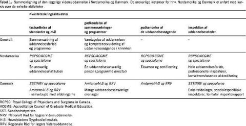 I Danmark har inspektorordningen indtil nu været frivillig og formativ, dvs. vejledende for kvalitetsudvikling, men uden konsekvens. Den danske inspektorordning skal ses i sammenhæng med andre kvalitetssikringsmekanismer for videreuddannelsen end det nordamerikanske system (Tabel 1 ). Den væsentligste forskel er specificering af ansvaret for uddannelsen og placering af kontrollen med kvaliteten. Speciallæge- anerkendelse (certification ) foretages i Canada af RCPSC og i USA af specialeselskaberne (American Boards of Medical Specialties).