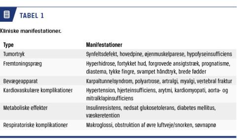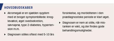 Akromegali er en sjælden sygdom med en årlig incidens på fire pr. million. Akromegali skyldes som oftest et væksthormonproducerende hypofyseadenom. Sygdommen diagnosticeres typisk med 5-10 års forsinkelse, og ubehandlet er den forbundet med betydelig morbiditet og øget mortalitet [1]. I et nyligt publiceret dansk studie dokumenteres det, at morbiditeten er signifikant øget allerede i den prædiagnostiske fase af sygdommen [2], hvorfor vi i denne artikel sætter fokus på akromegalis brogede symptombillede.