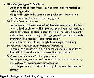Basert på erfaringene fra dette arbeidet er det mulig å formulere fallgrøfter som bør unngås (Figur 1 ). Den kombinerte rollen som lege og forsker åpner et rom for forskning som ikke er åpent for noen andre enn praktikeren selv. Informasjonen som samles fra reflekterende dialoger kan representere en kilde til verdifull kunnskap om personlige og eksistensielle aspekter ved praktisk klinisk medisin.