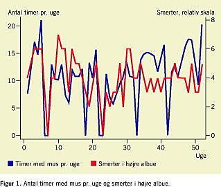 Ved hjælp af dette computerprogram er der indhentet oplysninger om eksponering og helbred hos 2.146 deltagere i op til et helt år. Oplysningerne er sammenfattet ugevis, så der for hver af de 52 uger er oplysninger om bl.a. den tid, man har brugt mus og tastatur, og ugevis symptomregistrering. I Figur 1 ses et typisk eksempel på en af deltagernes ugentlige registrering af timer med brug af musen i højre hånd og smerter i højre albue (målt på en skala fra 0 til 7). Figuren viser, at der er en stor ugentlig variation i såvel brugen af mus som i smerteangivelser, og at der for denne deltager ikke er nogen intuitiv klar relation mellem musebrug og smerter. Det er et stort fremskridt, at man nu kan måle eksponeringen objektivt, og at man forholdsvis billigt kan foretage hyppigt gentagne målinger over en længere periode af både eksponering og udfald hos et stort antal personer. Men hvordan skal man håndtere disse store datamængder, så støjen filtreres fra, og eventuelle sammenhænge står frem?