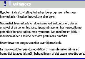Hvorvidt aktiv køling forbedrer prognosen efter et svært hovedtraume er fortsat omdiskuteret til trods for, at knap 20 studier med denne problemstilling er gennemført på voksne og børn de seneste to årtier. Selv om resultater fra dyrestudier og visse af de kliniske studier indikerer, at hypotermi kan være gunstig for prognosen efter svært hovedtraume, har resultaterne langt fra været overbevisende [1-6].
