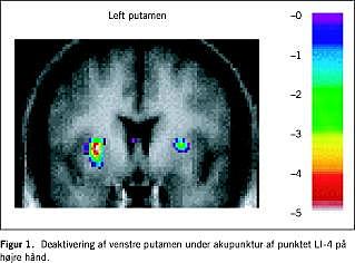 Herhjemme har Lise Schlünzen med PET fundet deaktivering af putamen ved stimulation af akupunkturpunktet large intestine (LI) 4, som er det hyppigst anvendte punkt ved smertebehandling. Formålet med dette forsøg var at undersøge effekten på regional cerebral blodgennemstrømning (rCBF) under akupunktur af det analgetiske punkt LI 4. Syv forsøgspersoner blev behandlet med akupunktur i dette punkt (gruppe 1), fire andre forsøgspersoner fik placeret en akupunkturnål i et »ikkeakupunkturpunkt« i området mellem 3. og 4. metakarpalknogle (gruppe 2). Forsøgspersonerne i begge grupper var bedøvet med 1 MAC sevofluran med det formål at minimere øvrige cerebrale input. Hver forsøgsperson fik foretaget en skanning under 1 MAC sevofluran-anæstesi og en skanning under 1 MAC sevofluran-anæstesi + akupunktur. I gruppe 1 fandt man signifikant nedsat rCBF i putamen og i mediale frontale gyrus, mens man i gruppe 2 fandt nedsat rCBF i mediale frontale gyrus. Dette forsøg viste altså, at nålepenetration af huden medfører nedsat rCBF i mediale frontale gyrus, mens stimulation af akupunkturpunktet LI 4 medfører nedsat rCBF i putamen (Figur 1). Resultaterne indikerer således, at den analgetiske effekt af akupunktur af LI 4 bliver medieret via putamen.