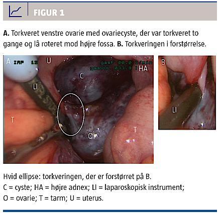 Patienten var objektivt alment medtaget med en temperatur på 38,5 °C og lokal peritoneal reaktion i højre fossa. Der var ingen tegn til hernier. På mistanke om appendicitis acuta blev der foretaget diagnostisk laparoskopi. Der fandtes en normal appendix, men et venstre ovarie med ovariecyste, der var torkveret to gange og lå roteret mod højre fossa (Figur 1