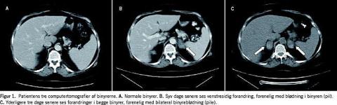 En 57-årig kvinde, der havde SLE og sekundært APS, blev indlagt på kirurgisk afdeling med diagnosen abdominalia. Patienten havde forud for indlæggelsen haft diffuse mave-smerter i tre uger med temperaturforhøjelse og kvalme. Ved indlæggelsen havde hun smerter i venstre fossa iliaca, et blodtryk på 141/93 mmHg og en temperatur på 37,7 °C. Patientens tilstand blev opfattet som forårsaget af en diverticulitis og antibiotisk behandling med metronidazol, gentamicin og penicillin blev iværksat. Patienten blev undersøgt med CT (Figur 1 ), men man fandt normale forhold, herunder også normale binyrer. Efter en initial bedring, forværredes almentilstanden på ottendedagen, og en ny CT dagen efter viste en affektion af venstre binyre, som i første omgang tolkedes som en absces. På tiendedagen fik patienten hypotension, og en tredje CT blev foretaget. Den viste let isodense områder i begge binyrer, hvilket tyder på blødninger. På dette tidspunkt havde patienten et blodtryk på 88/59 mmHg og blev tiltagende træt, mat og konfus.