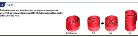 et forstadium til dissektion [9, 10]. Intramuralt hæmatom sidder oftest i den descenderende del af aorta og er associeret med højere alder end aortadissektion [10, 11]. Penetrerende aterosklerotisk ulcus defineres som en ulceration i aterosklerotisk intima med penetrering til media, hvilket kan føre til lokalt hæmatom i aortavæggen eller til ruptur [2, 3] (Figur 1). Trods den